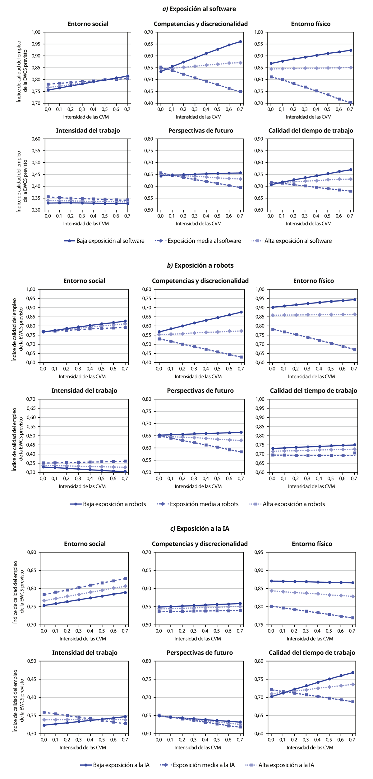 En los cuadros 1, 2, 3 se recogen los resultados de la estimación de la ecuación (1) obtenidos con seis índices diferentes de calidad del empleo procedentes de la EWCS y tres tipos de exposición tecnológica (los cuadros solo indican los principales coeficientes, pero los resultados completos pueden consultarse en los cuadros SA5–SA7 del anexo suplementario en línea). El cuadro 1 se refiere a la exposición tecnológica (tecn) medida como exposición al software, mientras que los cuadros 2 y 3 se refieren a la exposición a los robots y a la IA, respectivamente.