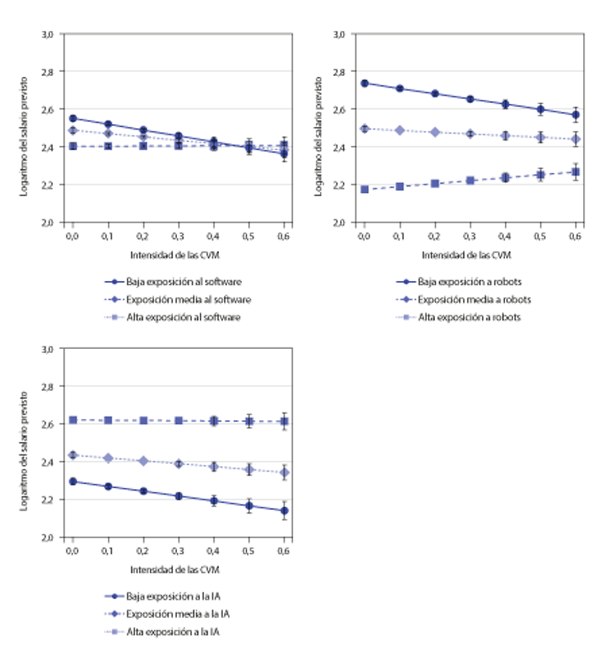Logaritmos de salarios previstos debido a los cambios en la intensidad de las CVM a diferentes niveles de exposición tecnológica de los puestos de trabajo (ilustración de los resultados que figuran en el cuadro 4)